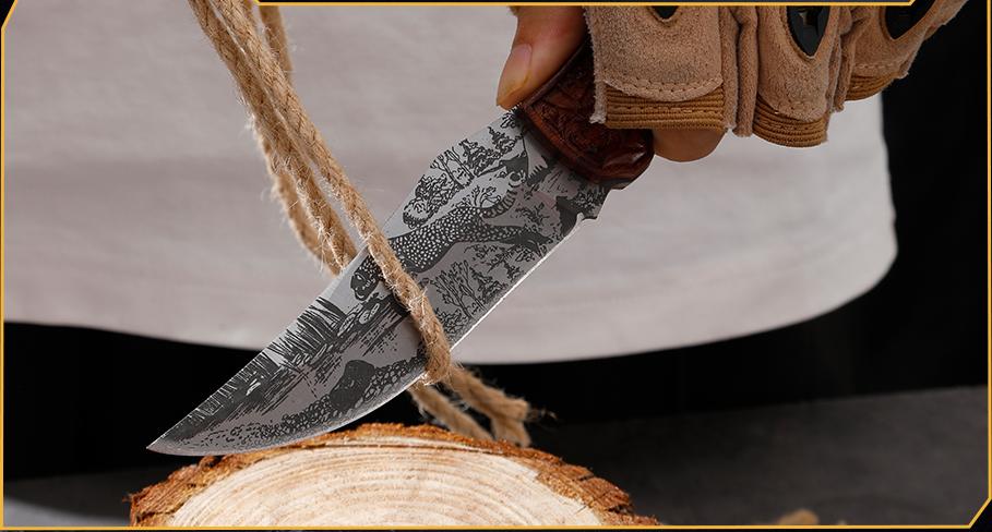 Leopard/Bird Engraved Outdoor Straight Hunting Knife Wood Handle Corrosion-Resistant Steel-KC3209